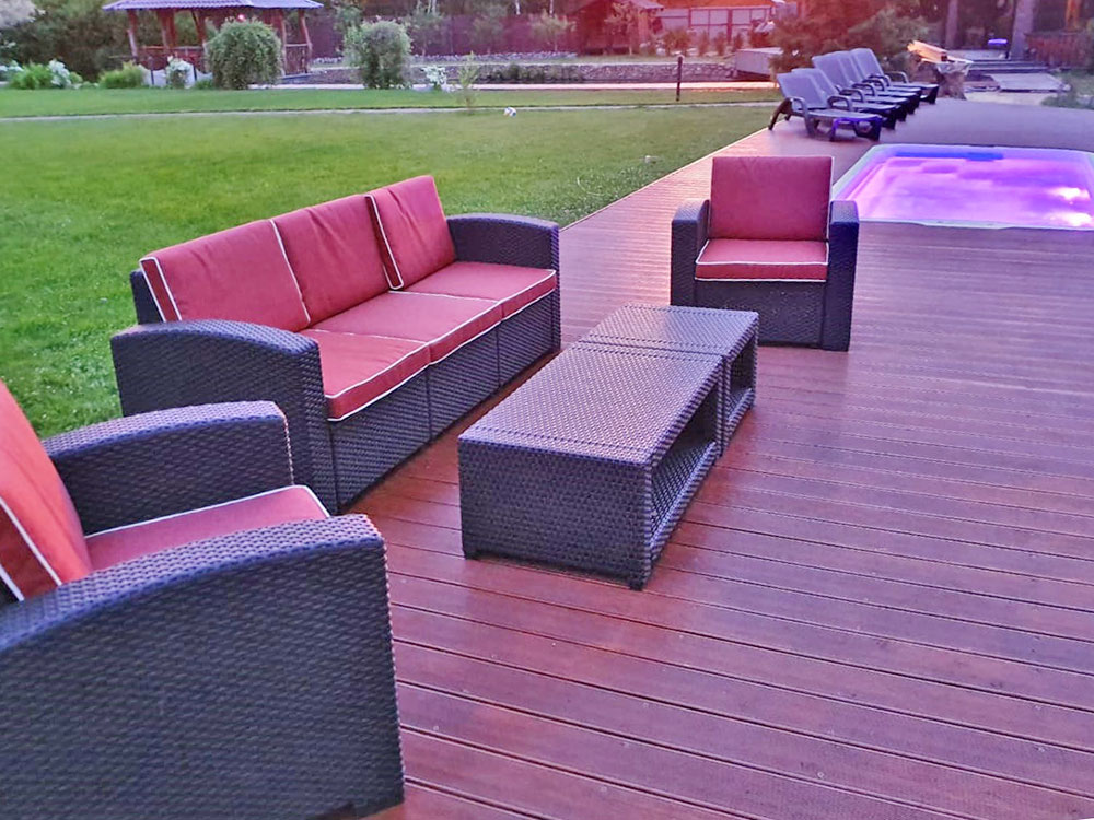 Мебель-мебелью, но нам пришлось еще и подумать о формировании самого пространства для отдыха. И т.к. на территории предполагалось разместить еще и бассейн, то нам потребовалась доска с максимальной устойчивостью к влаге, доска которая не боится высокой влажности и частого контакта с водой. И для этих целей нам подошла доска Holzhof, с отличными свойствами и имитацией настоящего дерева.